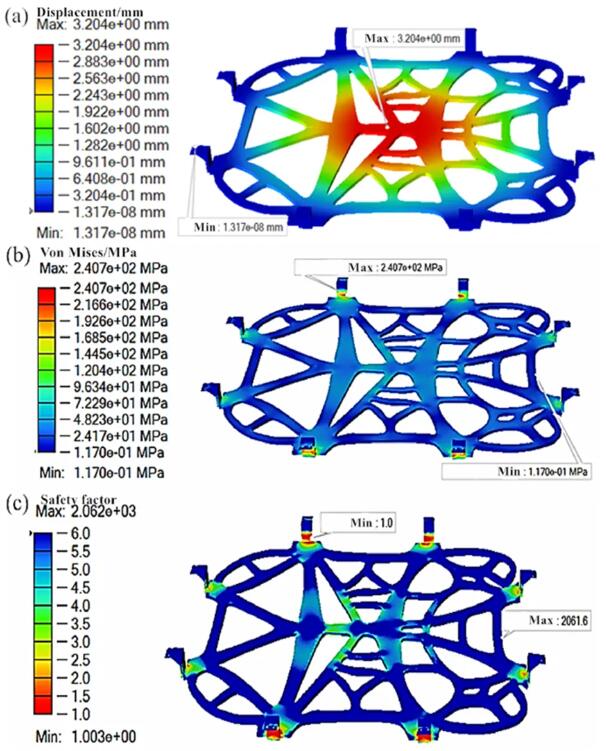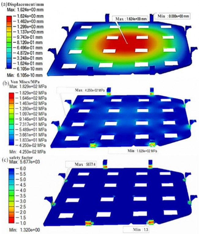 ▲電池載體的受力分析結(jié)果:(a)位移云圖;(b)應(yīng)力云圖;(c)安全系數(shù)。