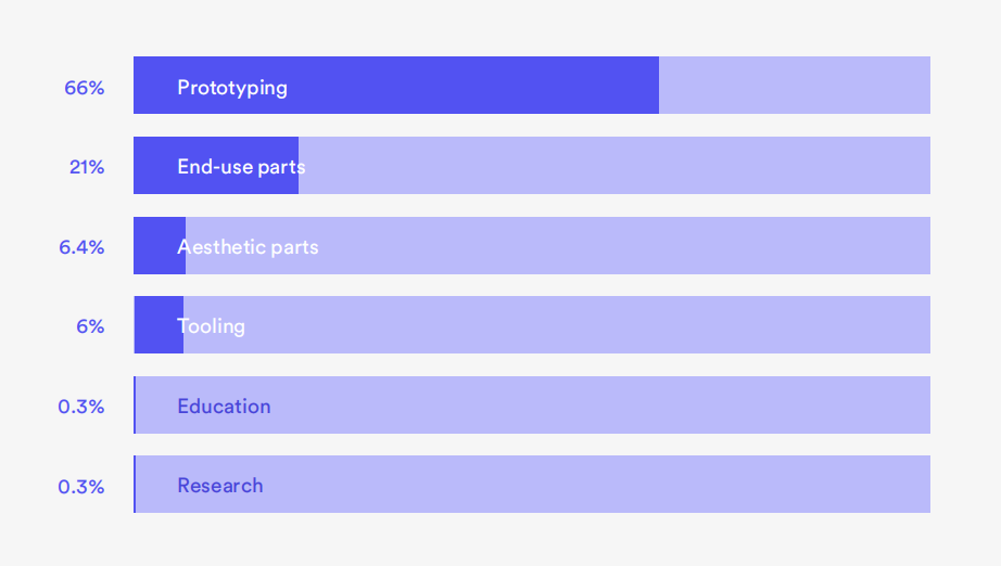 原型制作在全面生產(chǎn)之前開發(fā)樣品產(chǎn)品以評估設計和功能是3D打印的第一個真正用途,并且仍然占很大份額。66%的受訪者將其列為3D打印的主要用途。其他關(guān)鍵應用包括加工、小批量生產(chǎn)、大規(guī)模定制和批量生產(chǎn)。